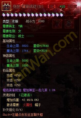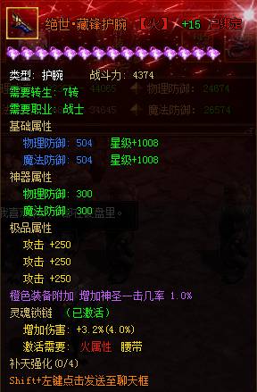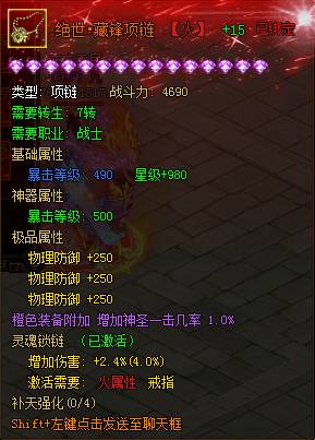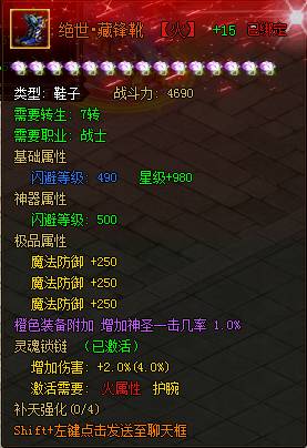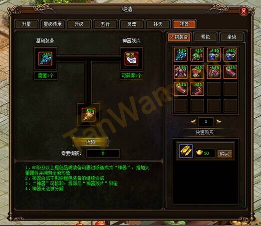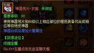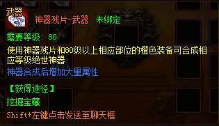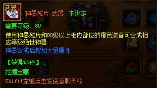 使用神器残片可以和80级以上相应部位的橙色装备合成相应等级的【绝世神器】,神器可额外给人物增加大量属性并改变装备外观形象。