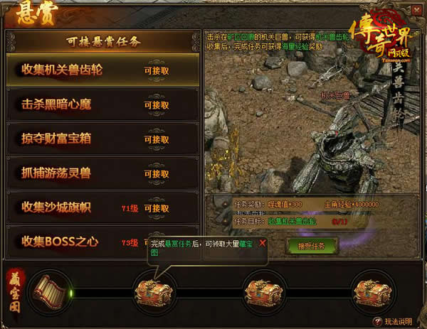 悬赏任务中,分为:收集机关兽齿轮、击杀黑暗心魔、掠夺财富宝箱、抓捕游荡灵兽、收集沙城旗帜、收集BOSS之心等任务。任务会随着角色等级升高而解锁,任务难度也在逐步增加。