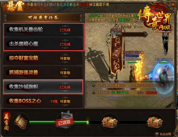 《传奇世界》网页版的悬赏任务,是分等级的。角色等级越高,能接的悬赏任务越多。完成悬赏任务达到一定次数可以激活悬赏宝箱,激活宝箱之后可以领取藏宝图,而藏宝图,可以挖掘出神秘宝藏和BOSS.