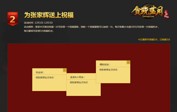 有礼包,有蜡烛,怎么能没有蛋糕!《贪玩蓝月》精心为代言人张家辉准备一个大型蛋糕盘,凡为张家辉送上都真挚的祝福,就可获得一个张家辉小蛋糕,每日累计充值100元还可获得一次送祝福的机会,最多可获得5次送祝福机会。一天5个小蛋糕,再也不怕不能和明星一起过生日了。