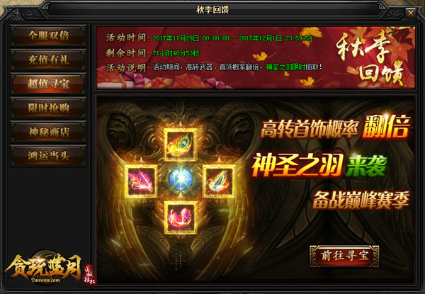 《贪玩蓝月》最后一次秋季回馈活动终于来啦(虽然早已冬季了),众多福利回馈活动是各位玩家不能错过的。比如充值返好礼,充得越多返得越多,任性最后这一次;寻宝概率翻倍,高转首饰,神圣之羽备战你的巅峰赛季;极品材料特价限时出售,超低价格, 助你迅速提升实力;《贪玩蓝月》秋季回馈仅剩最后一天,赶紧来领走属于你的那一份回馈吧!