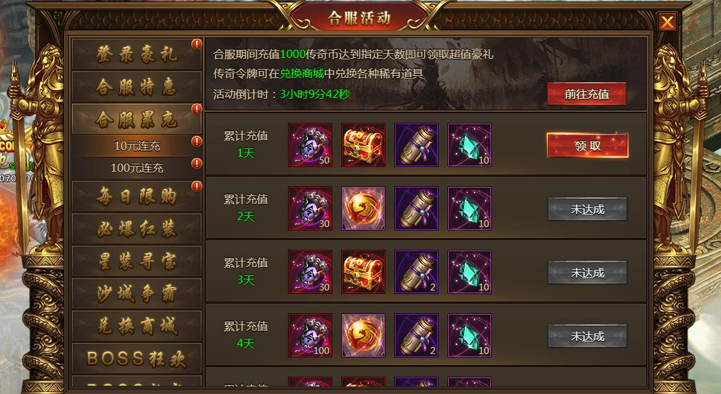 合服1-7天玩家充值10元和100元档次达到指定天数即可领取超值豪礼