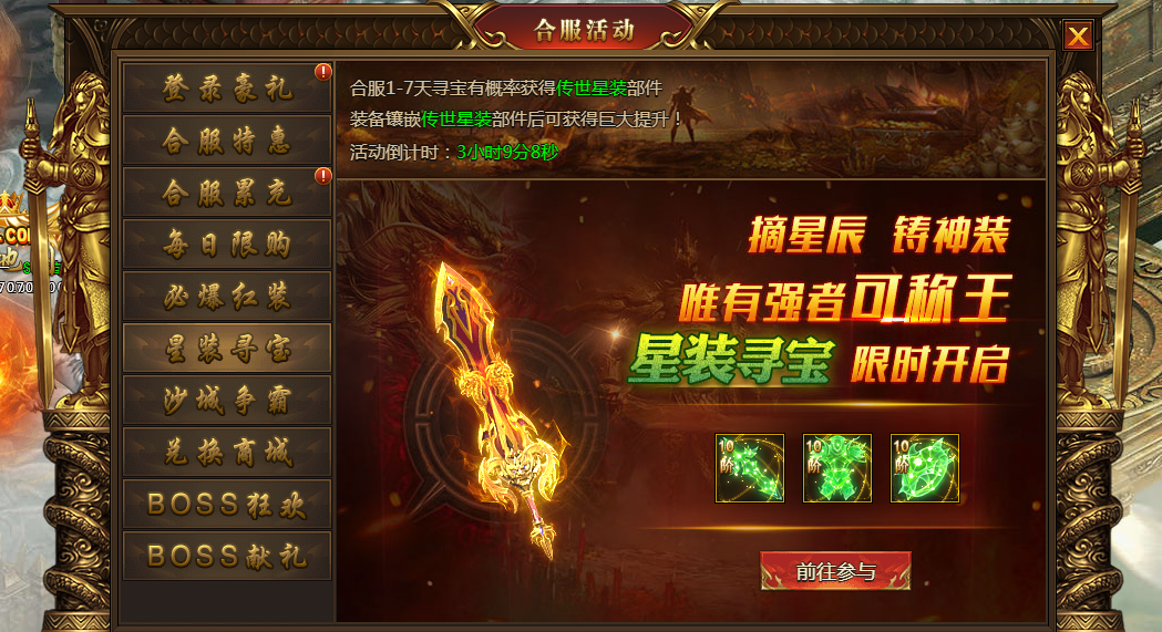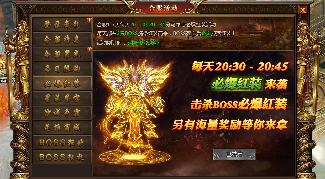 合服1-7天每天20:30-20.45分可进入必爆红装副本,副本里有3只红装BOSS,击杀后必定掉落红装