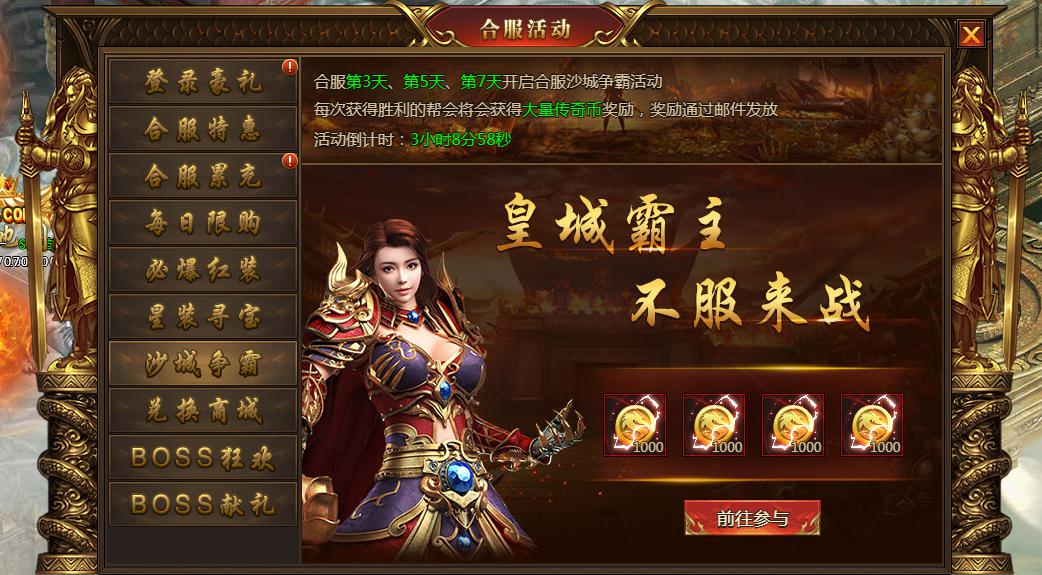 合服3、5、7天开启合服沙城争霸活动,胜利的帮会将会获得大量传奇币奖励