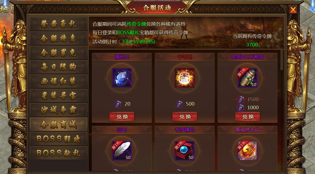 合服1-7天期间玩家可使用传奇令牌在兑换商城中兑换稀有极品道具