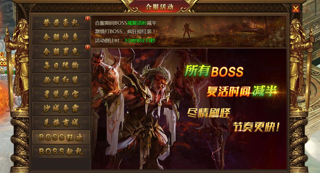 合服1-7天期间所有BOSS的复活时间减半(跨服BOSS不计算在内)