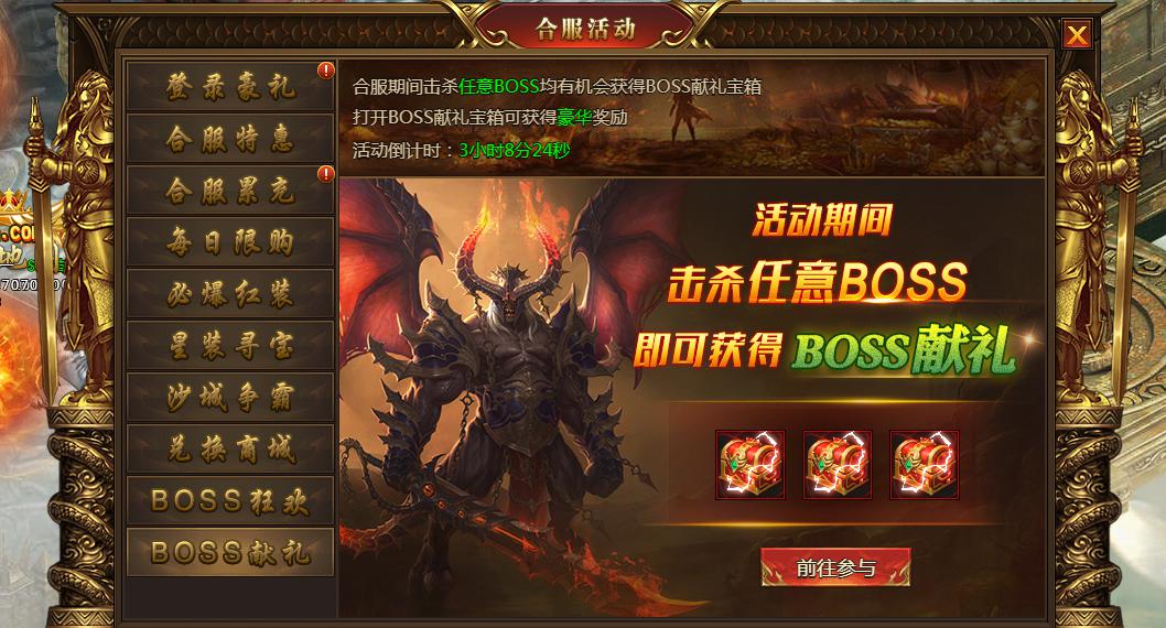 合服1-7天期间击杀所有BOSS均有机会获得BOSS献礼礼盒,打开后可获得稀有奖励