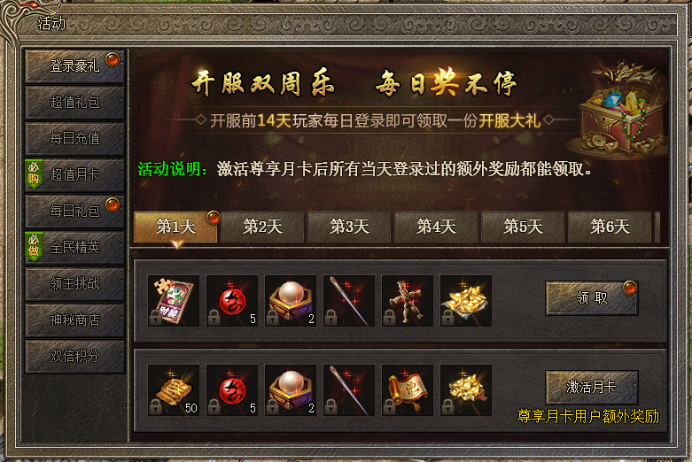 说明:玩家每日登录游戏即可领取丰厚大礼,累计登录7天、14天即可领取“赤胆忠心”时装与“青龙偃月刀”幻武,“尊享月卡”用户每日还可再领取一份额外奖励