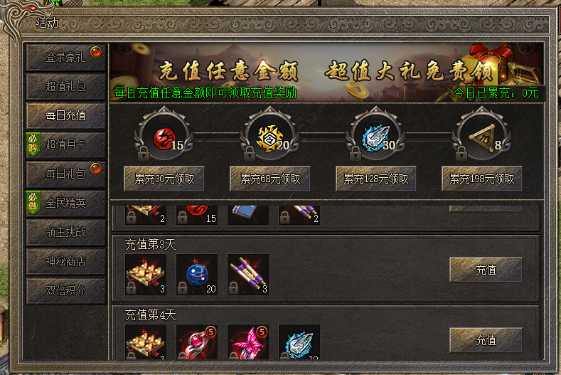 说明一:每日充值任意金额,即可领取海量稀有道具,更有“5阶麻痹戒指”、“5阶复活戒指”、“6阶暴击宝珠”等你来领!若每日累计充值金额达标,更可领取对应的稀有道具奖励