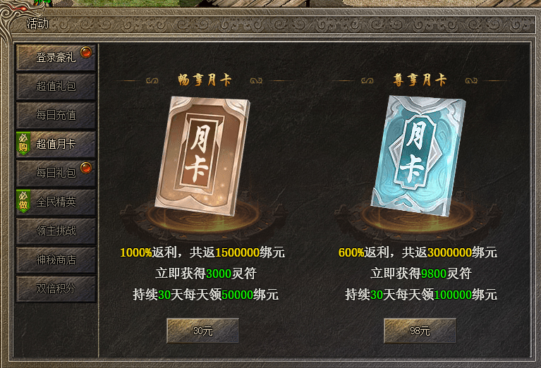说明:只需在此界面充值30元购买畅享月卡,就可以领取3000的灵符,同时获得500%的返利,一共返回150W绑元。还在等什么,心动不如行动。