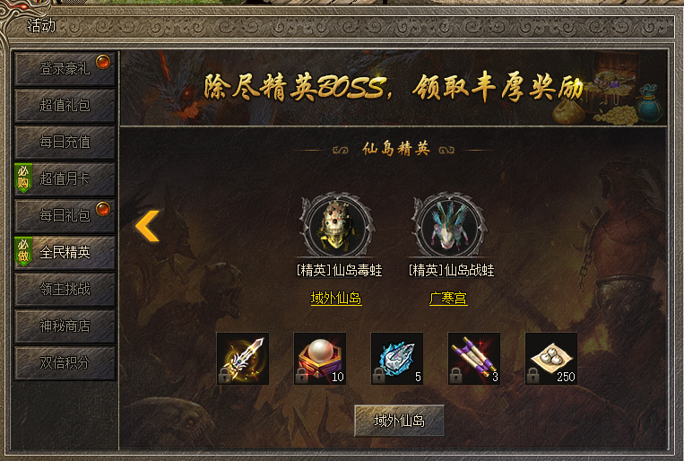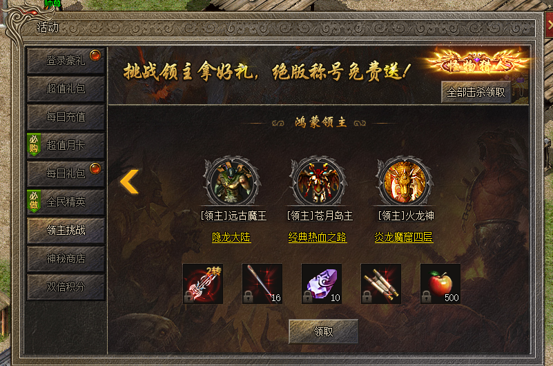 说明:该礼包一共有10档,只要击杀指定地图指定怪物,即可免费领取Boss大礼,高级装备、高级材料拿到手软!还在等什么,赶紧来参加吧。