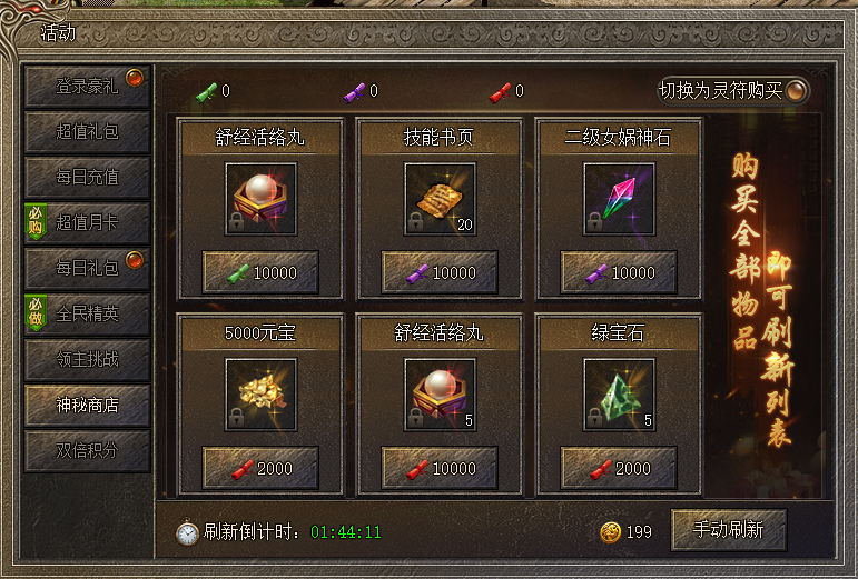 说明:玩家可使用“精英积分”、“BOSS积分”、“领主积分”、“灵符”来购买稀有道具,积分均可通过击杀“精英怪物”、“BOSS”、“领主”来获得;使用灵符购买,还有折扣优惠