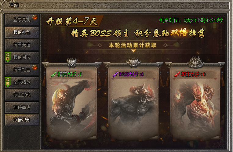 说明:开服第4~7天开启“双倍积分”活动,玩家击杀“精英怪物”、“BOSS”、“领主”可掉落双倍的积分卷轴。