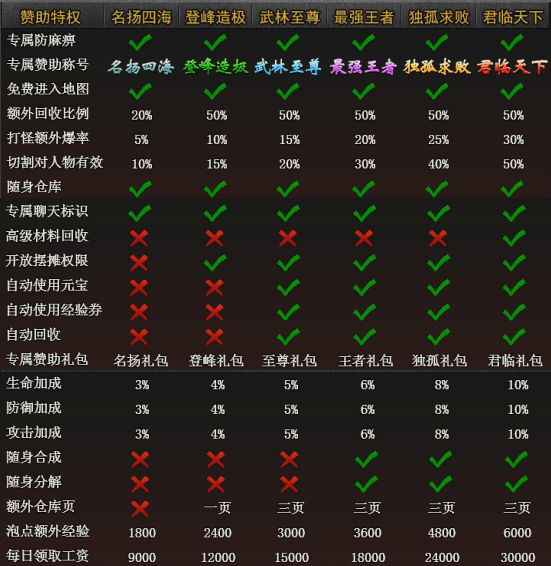 玩家可通过购买赞助特权激活特权功能(激活可获得专属称号)。特权系统有6个档次,每个档次所需要的灵符和其对应的特权都不相同。
