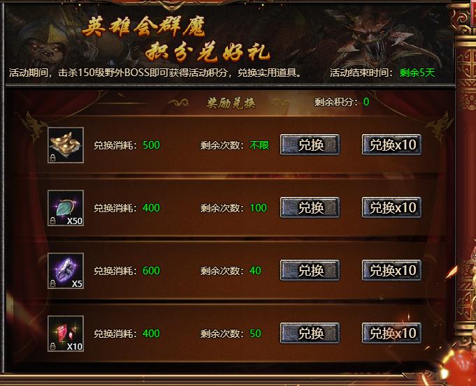 活动说明:活动期间击杀指定等级野外BOSS即可获得活动积分,兑换实用道具。