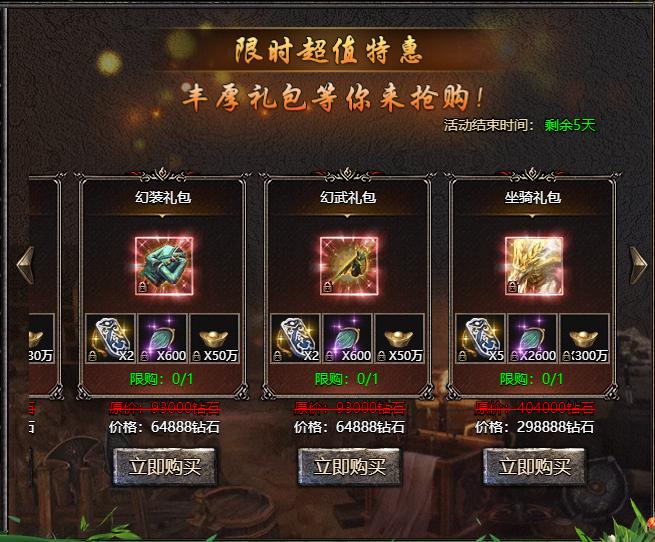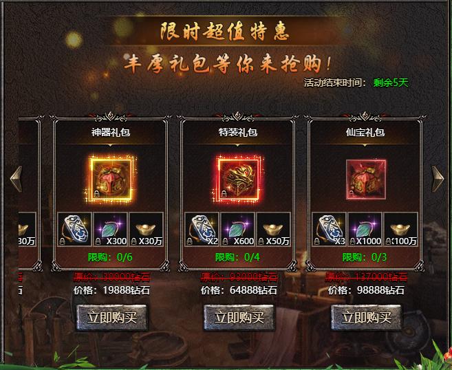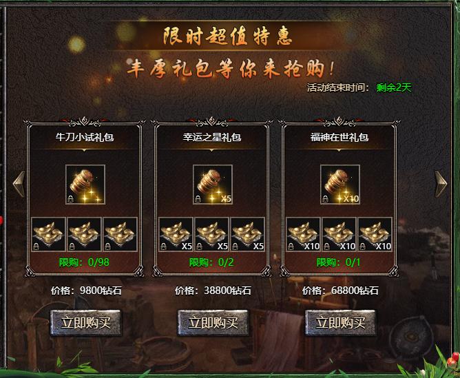 活动说明:活动期间将上架限购礼包,限时上架供玩家购买。