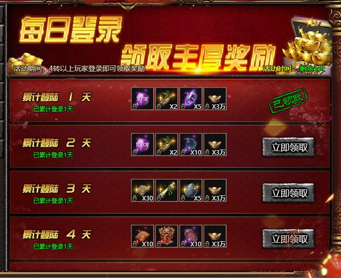 活动说明:活动期间,4转以上玩家累计登录即可领取奖励。