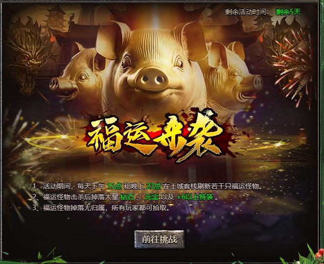 活动说明:每天下午15点和晚上23点在土城客栈刷新若干只福运怪物,击杀后掉落大量钻石、元宝以及+6以上特装。