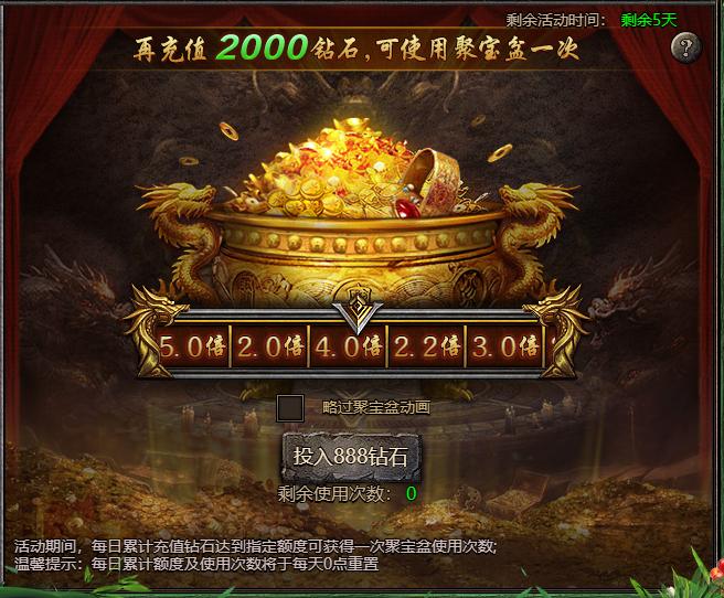 活动说明:活动期间玩家每日充值到达指定金额即可获得一次聚宝盆使用次数,消耗使用次数以及一定数量钻石将获得轮盘指向倍率*消耗钻石数量的绑定钻石返利。