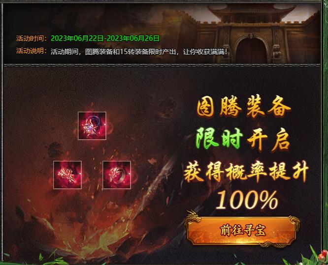 活动说明:活动期间探宝几率提升,图腾装备获得概率提升。