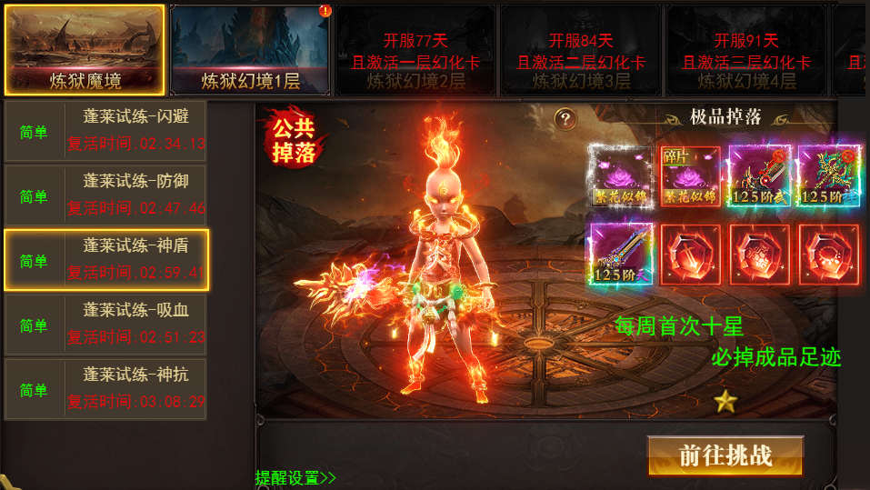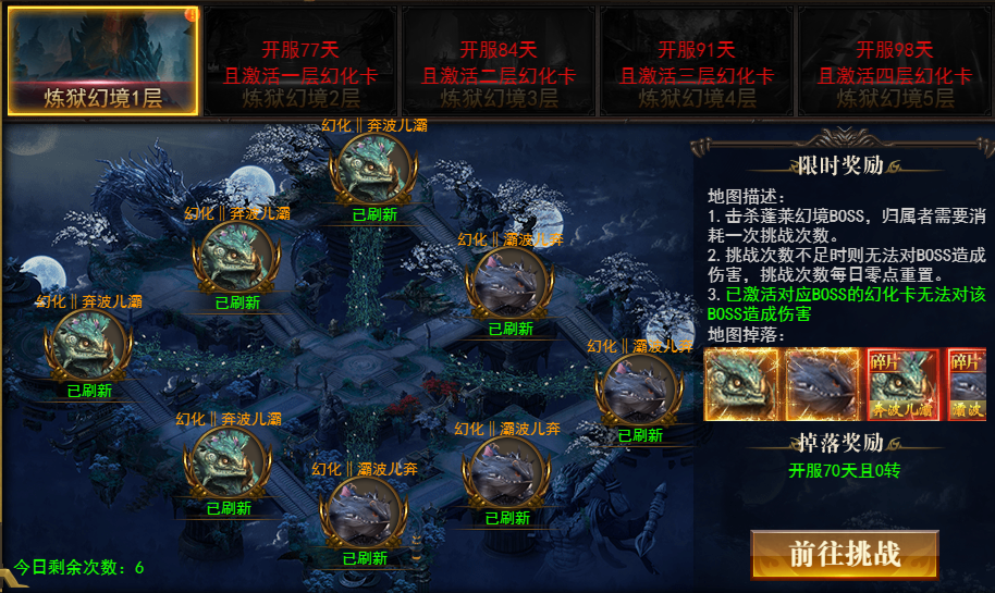炼狱幻境主要产出BOSS幻化成品、幻化碎片及妖精魂玉,达标一定开服天数并激活对应幻化后可挑战更高层幻境;