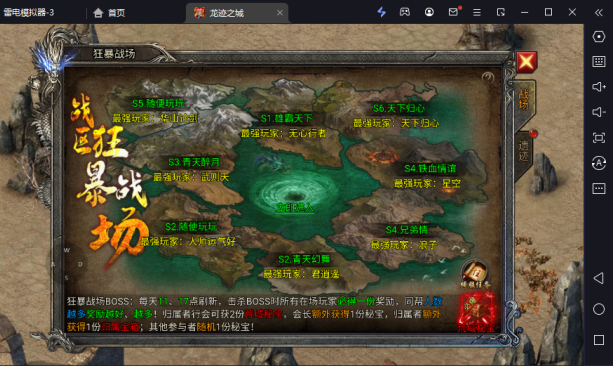 该地图属于合区后开启的地图,8个区的玩家争夺,属于跨服地图。每天会在中午的11点和下午的17点刷新怪物。击杀狂暴至尊在场的所以玩家都可以获得奖励,人数越多奖励越好,如是归属行会会获得两份奖励。归属者会长额外获得一份奖励,归属者本身也是。