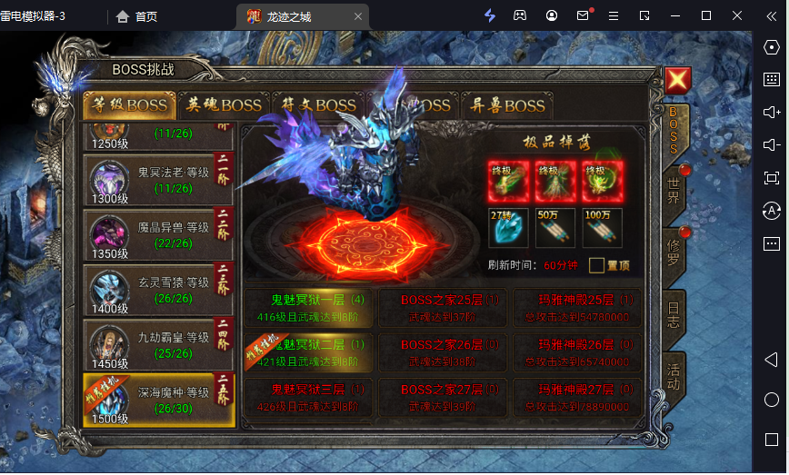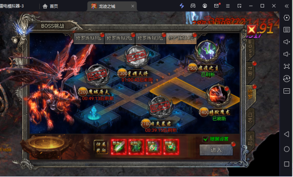 修罗炼狱总共分为4分,也是属性玩家福利地图,属于个人地图其他玩家无法帮忙。每一层有5个boss,玩家可以根据自己的战力去对抗boss获得奖励。产出各种高级装备等材料。该地图玩家参与较多,主要刷新较快奖励丰厚。无限制次数。开启时间:开服第一天。