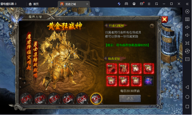 每晚的20.30开启,开服第三天第七天,和开服7天后续的每周六都是休战此活动。玩家可以选择一味boss进入地图争夺,如争夺成功,归属行会和在该地图的玩家都会获得奖励。其他玩家可以获得参与奖励,
