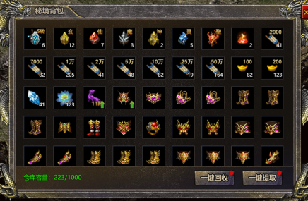 3. 功能说明:为解决原始秘境刷怪卡顿,新增原始秘境专属临时仓库,原始秘境中挂机打怪,爆出物品统一进入临时仓库,背包中开启自动回收临时仓库也会开启,仓库满了自动回收,玩家可随时提取仓库中物品。