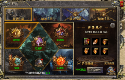3. 功能说明:神话禁地每层有四个洪荒boss与一个洪荒霸主,传说boss共享归属次数,上限8次,每天0点+4次,传说霸主不占归属次数,每日可参与击杀获得奖励,多倍奖励消耗禁地挑战令,不额外消耗次数获得更多奖励,特权多倍需要额外消耗1次归属,多获得1份奖励,可与多倍奖励叠加