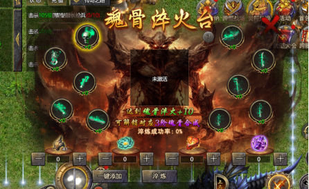 3. 功能说明:在魂骨淬火台投入淬火材料可提升淬火成功率,淬火成功魂骨将获得高额属性增幅,每个部位的魂骨淬火达到+10可解锁对应部位的三阶魂骨合成,每日12:30刷新【森林之主】不死炎龙,参与击杀可根据伤害排名获得丰厚奖励。