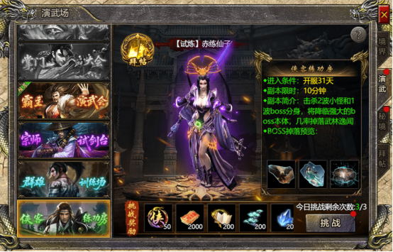 3. 功能说明:与江湖侠士演武场以武会友,获取侠义奖励,演武场副本每天3次,所有演武场共享次数,解锁高级拜帖可进入更高级的演武场