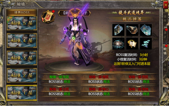 3. 功能说明:达到指定江湖境界可进入不同秘境地图,秘境刷新武道首领,击杀有几率掉落逸闻装备