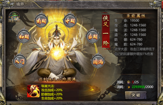 3. 功能说明:消耗侠义提升境界,获得属性增幅,对低于自身境界的玩家造成额外压制伤害,达到指定境界还有额外强力buff加成