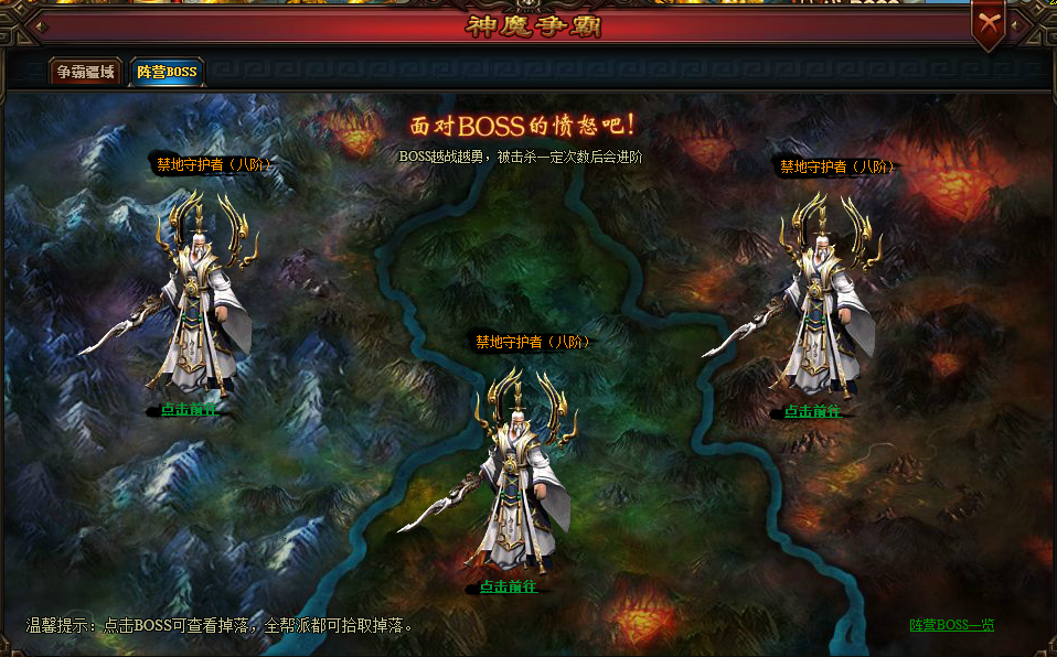 e)玩家以帮派为单位争夺BOSS,全帮派成员都可拾取BOSS掉落。