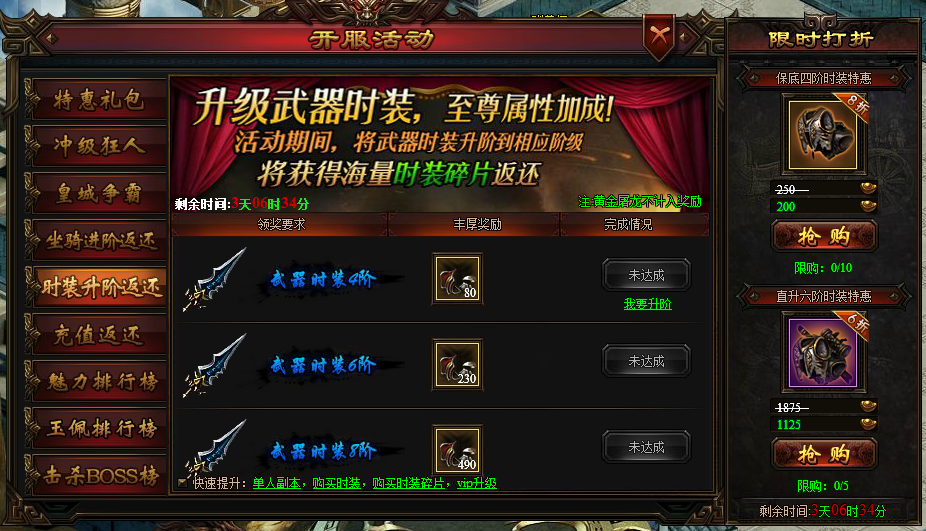 >开服活动的时装升阶返还与坐骑进阶返还界面的右侧将显示折扣商店的界面