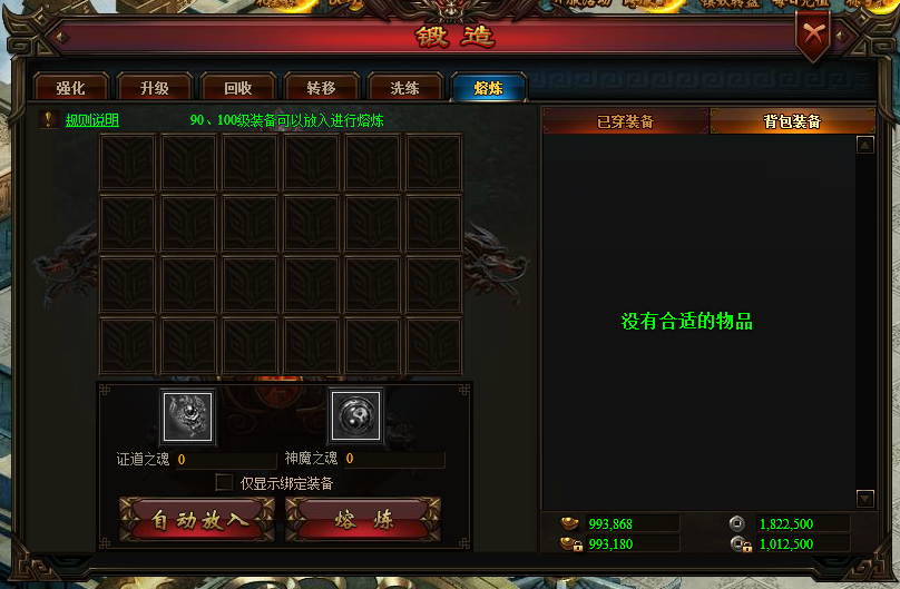 >可将证道装备与神魔装备分别熔炼成证道之魂与神魔之魂