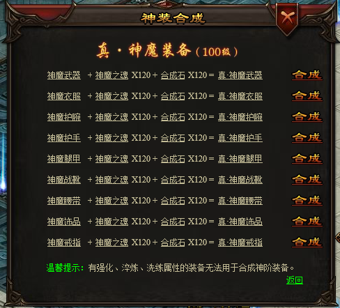 >新增真神魔装备,可用1件相应部位的神魔装备,再加上神魔之魂以及合成石,合成为真神魔装备
