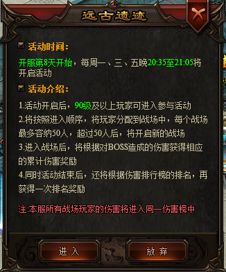 a)开服第8天起,每周一、三、五晚20:35至21:05将开启远古遗迹活动,90级及以上玩家可进入