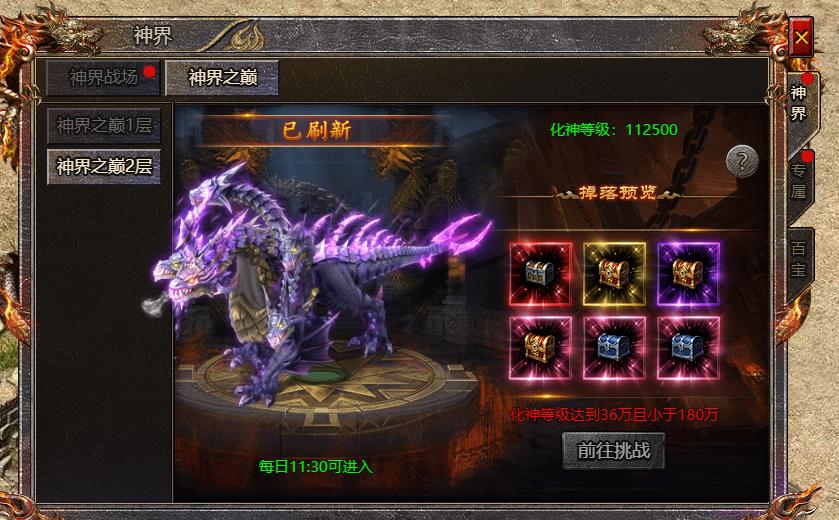 2、玩家可在神界战场和专属秘境中击败boss获得化神装备、神女装备以及神女魂灵