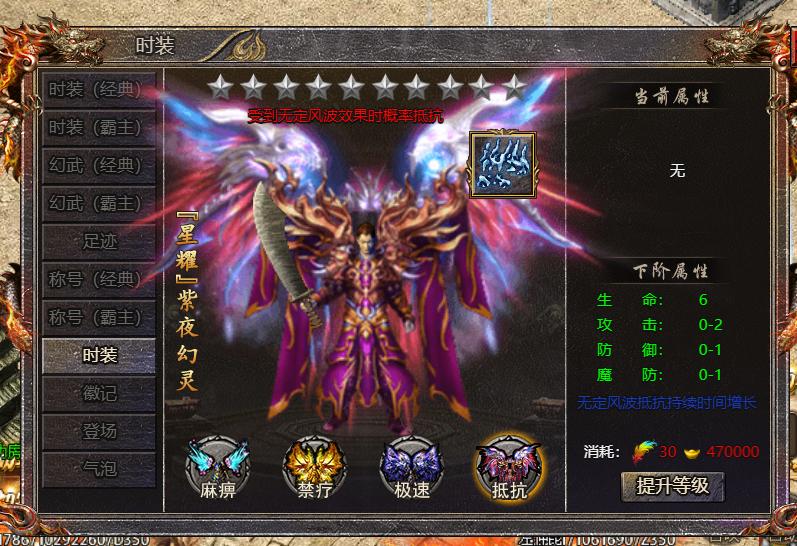 2、时装界面可消耗七彩羽毛升星抵抗时装,受到无定风波效果时概率免疫,升级时装可增加无定风波免疫时长