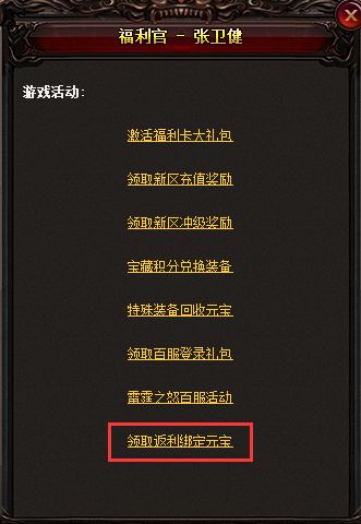 活动说明:活动期间,充值成功后,可在雷霆之城NPC“福利官-张卫健”处,领取充值元宝数的20%的绑定元宝返利,充值越多,返利越多哦