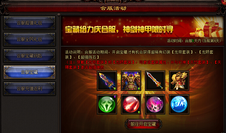 活动说明:合服活动期间,开启宝藏即有机会获得超稀有幻装【龙帝·神剑】、【龙帝·神甲】、【阵石】