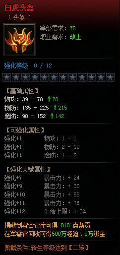 合成后的神转生装备,会增加大量内力值,增加内力恢复效果,同时具有暴击伤害减免效果(以白虎头盔示例如下)
