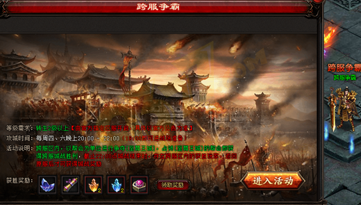 1、每周四、六晚上20:00-22:00开启跨服攻城,19:00可开始进入跨服区,跨服区由官方指定开启。(跨服战暂时处于测试阶段,具体开启时间以公告为准)