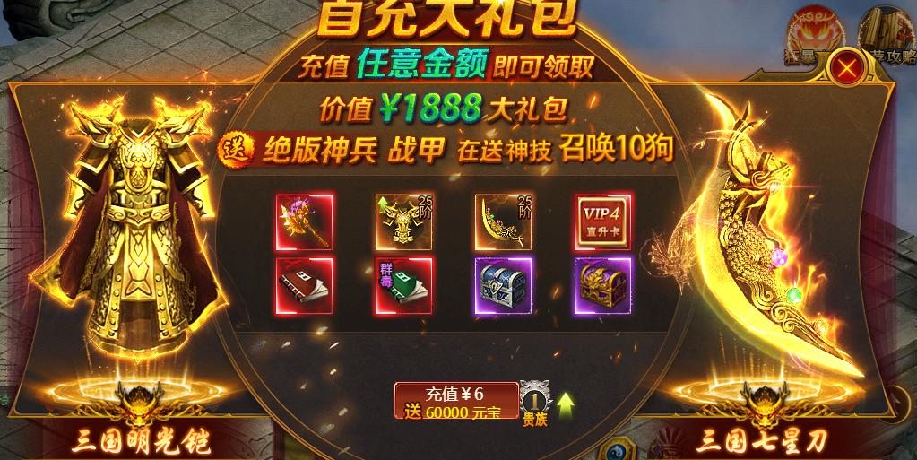 首充后可获得极品装备、时装、技能和vip等级