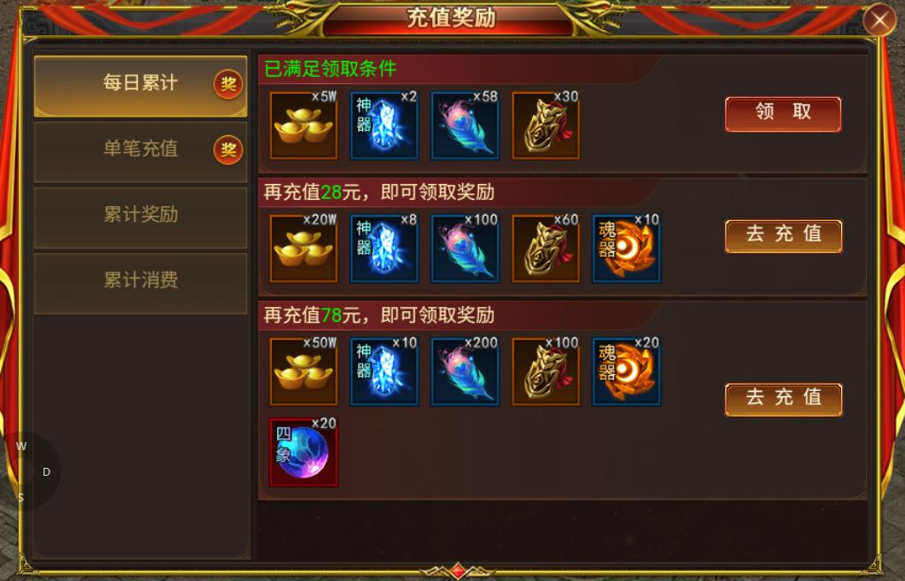 充值奖励分每日累积奖励,单笔充值,累计奖励,累计消费四种奖励,可获得元宝和各种极品材料
