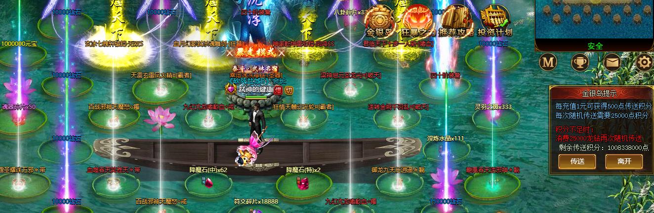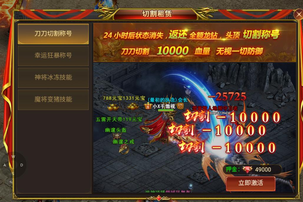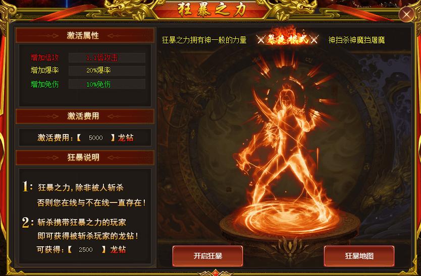 3.狂暴状态下,被击杀状态消失,属性消失,称号消失,击杀玩家获得2500龙钻