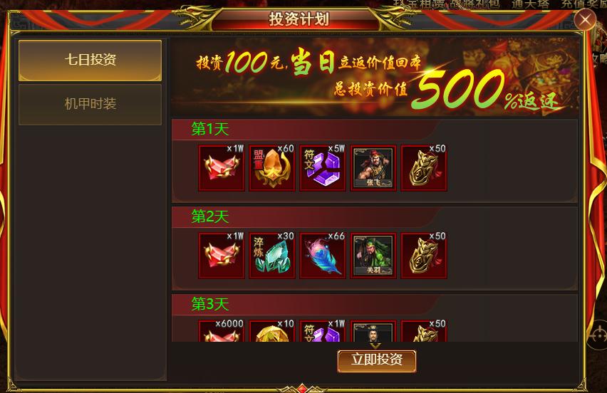 2. 七日可以领取价值100元的龙钻和价值400元的材料,总投资价值500%返还