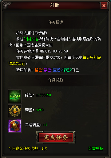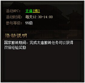 2:太庙搬砖双倍经验奖励,开启时间,每天12:30—14:00玩家在太庙搬砖双倍活动期完成任务可以获得双倍奖励